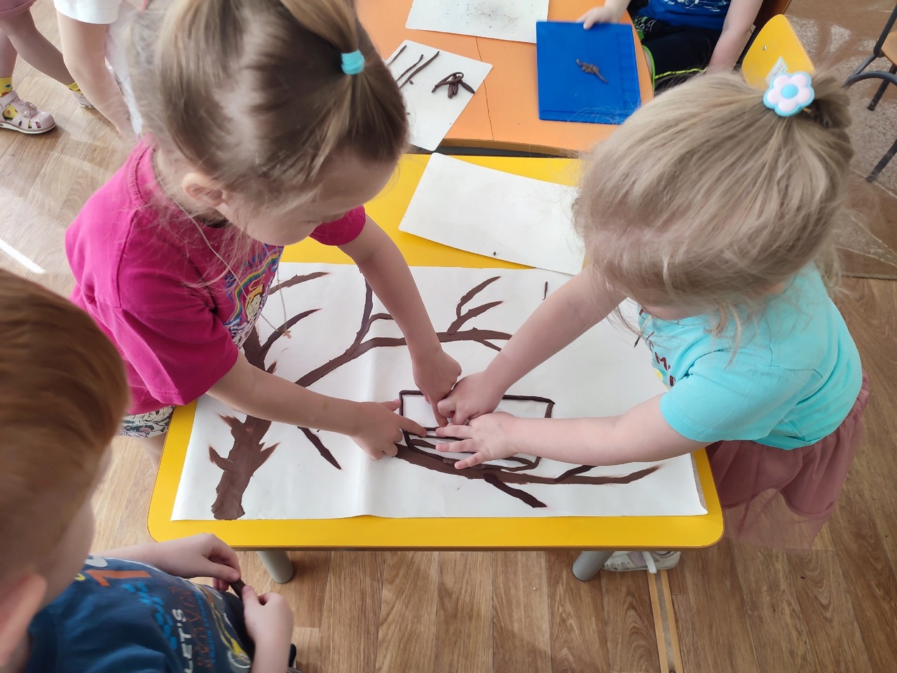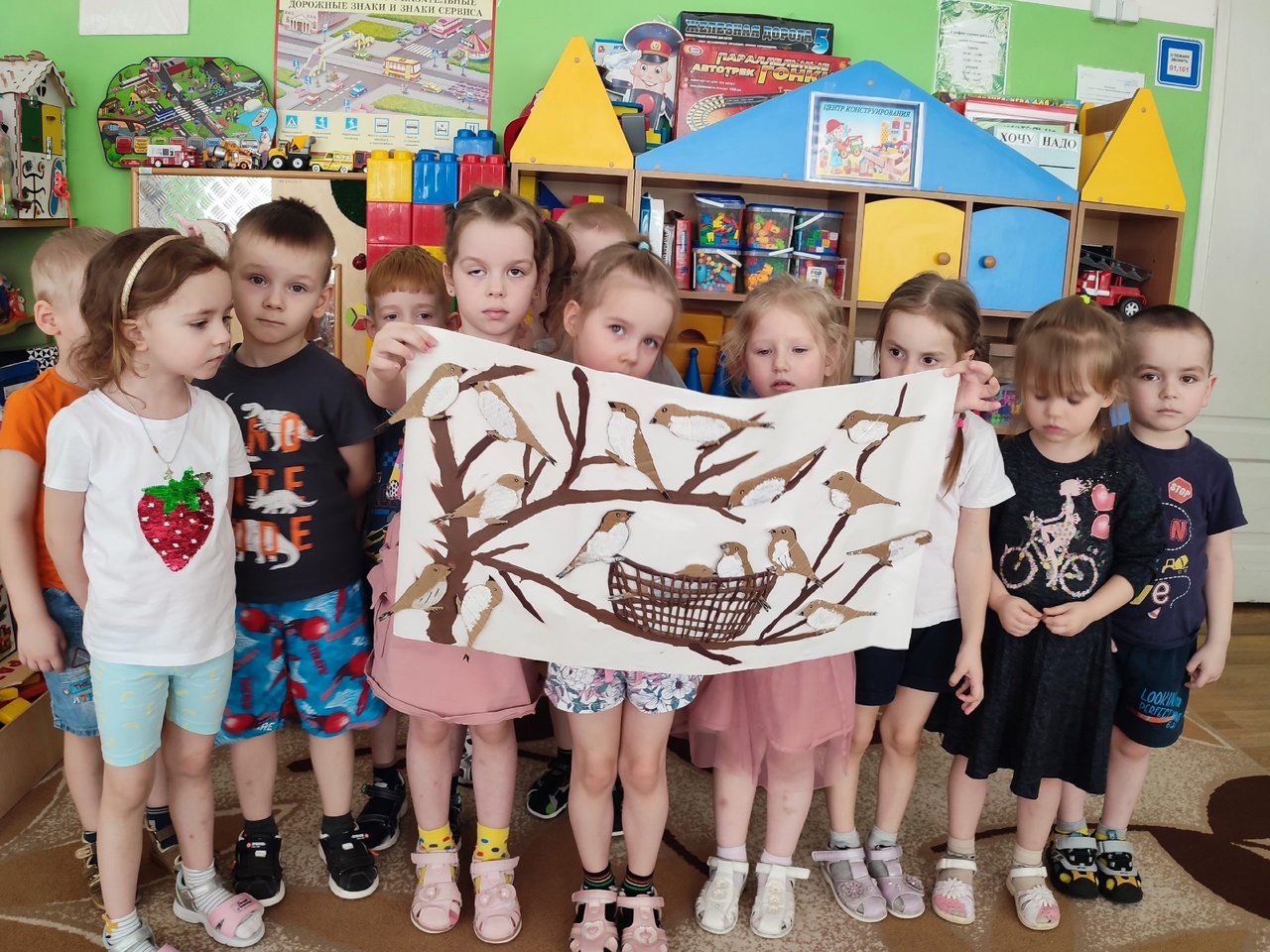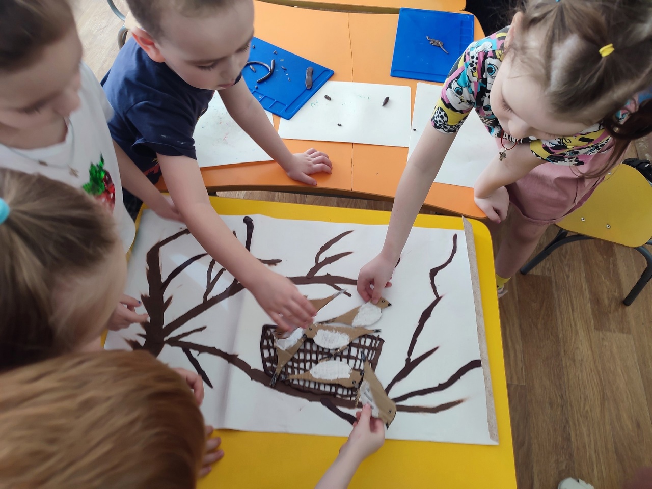 Создавая коллективную работу " Весёлые воробьи" ребята узнали,что эти птицы очень дружные.