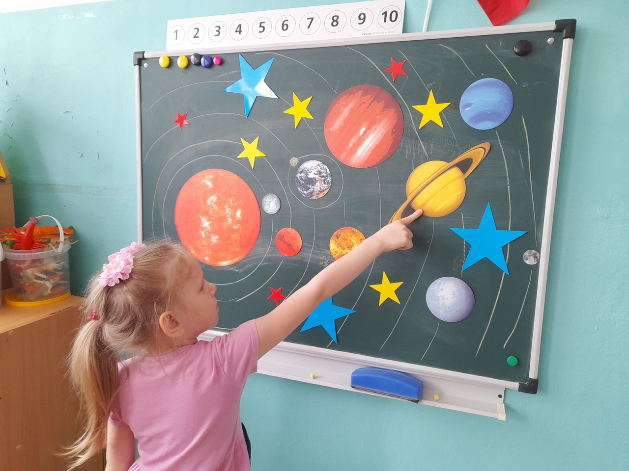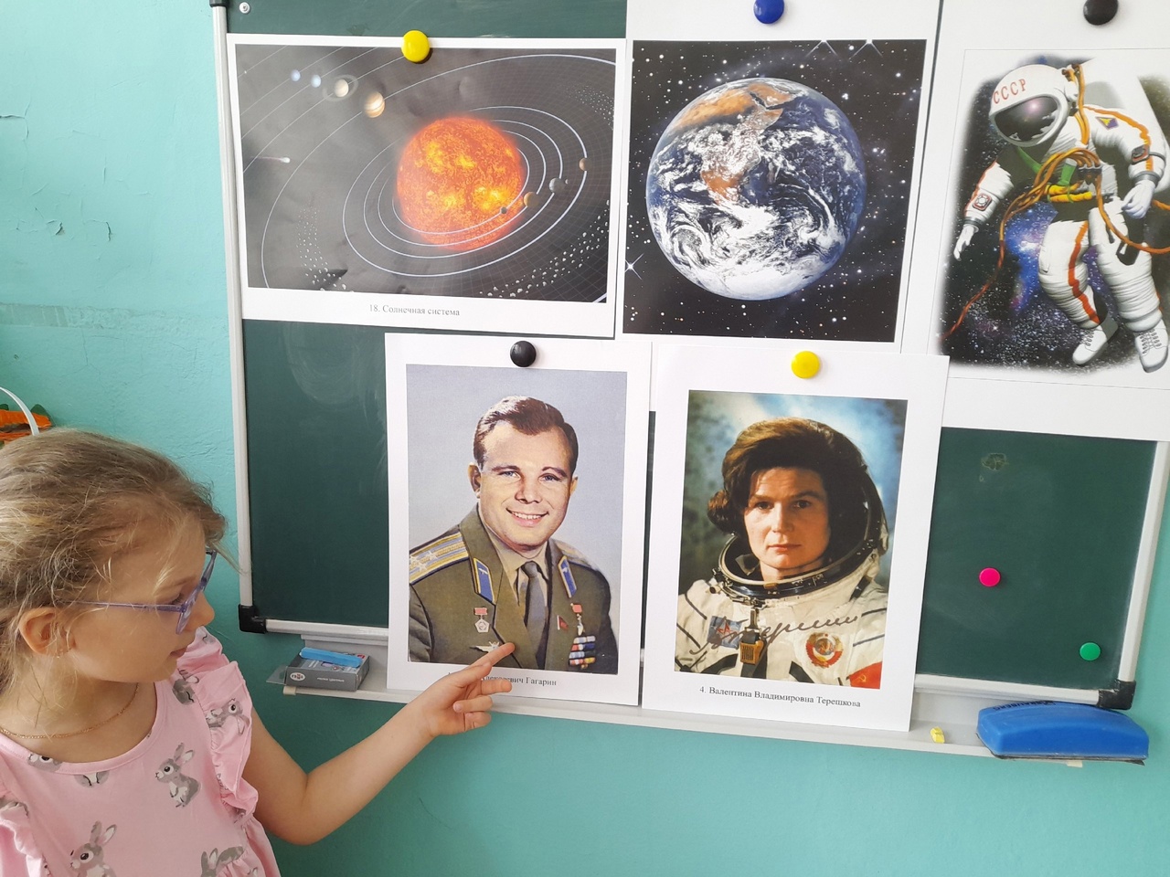 В процессе экспериментальной деятельности дети узнали о форме планет, их размерах, о движении вокруг своей оси; познакомились с космонавтами, уточнили значение слов: «скафандр», «спутник», «созвездие», «метеорит», «орбита», «телескоп», рассматривали фотографии первых спутников, космических станций и героев космоса, о Белке и Стрелке – первых космических собаках — путешественниках, о первом космонавте — Юрии Гагарине и о первой женщине-космонавте — Валентине Терешковой.