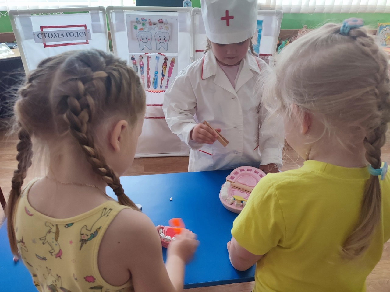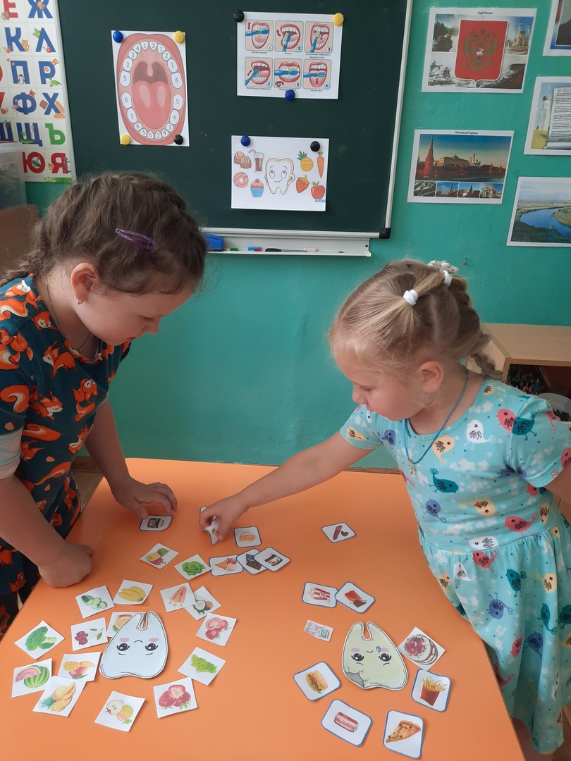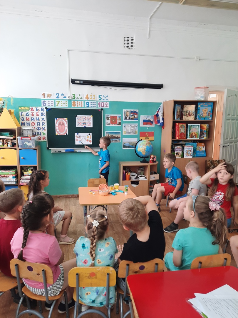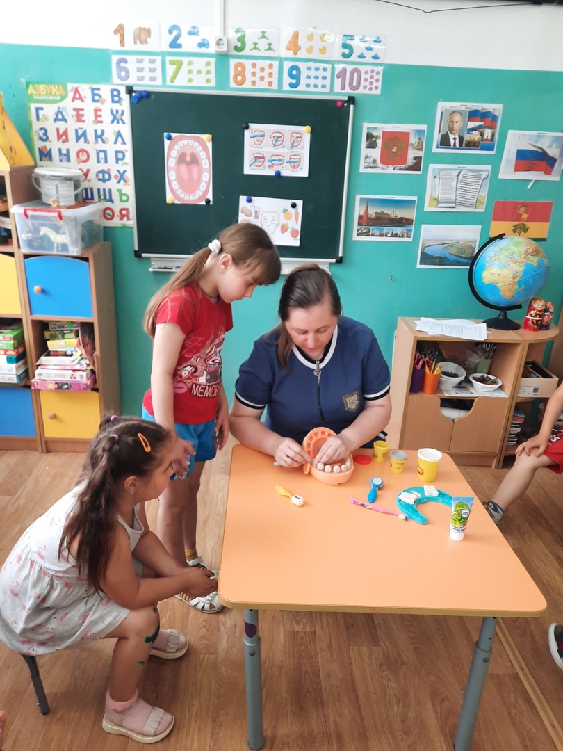 Воспитатель объяснил детям на наглядном примере, как правильно чистить зубки и в какой последовательности. Ребята в игровой форме чистили зубки зубными щетками. Поиграли в игру "Полезная и вредная еда для зубов", закрепили умение делить их на группы. Поиграли в игру "Стоматолог". Сейчас воспитанники знают, какой врач лечит зубки, сколько раз нужно чистить зубки, что приносит вред и пользу зубам!
