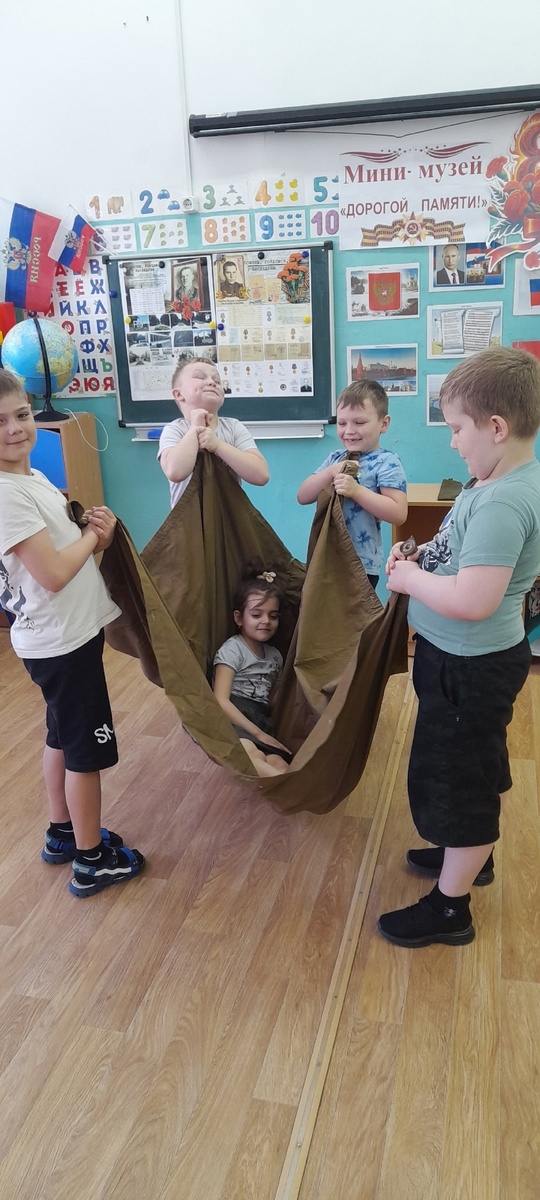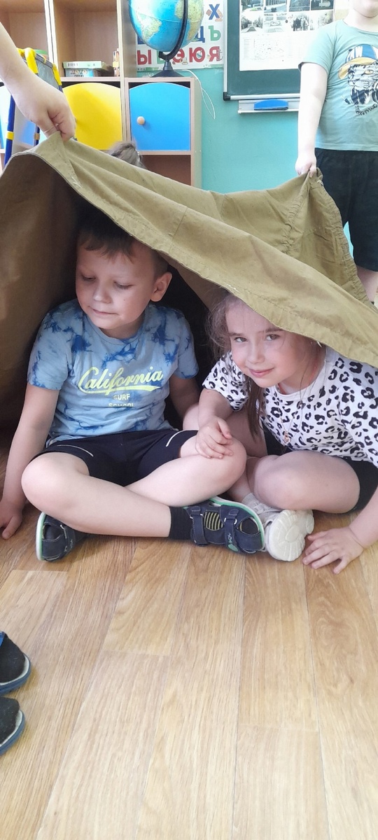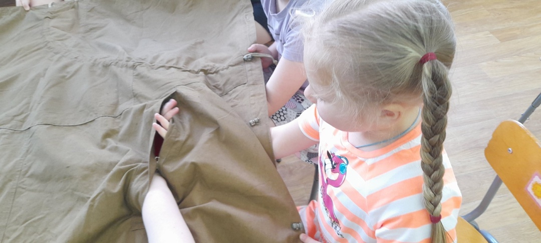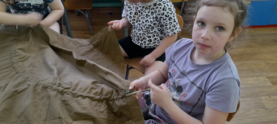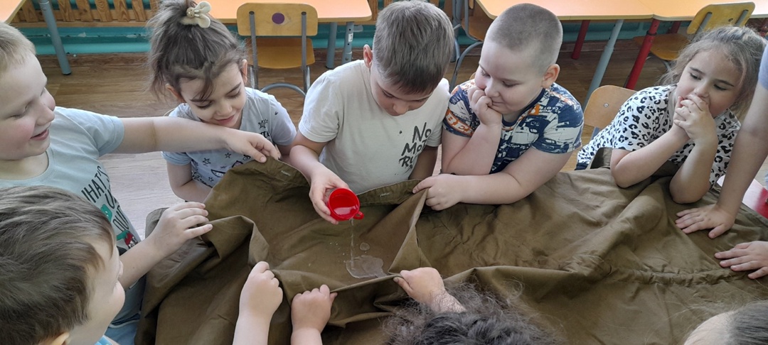 Прошло 80 -летие Победы в ВОВ, а интерес у ребят подготовительной группы к военной теме остался. Мы продолжили более подробно изучать один из экспонатов нашего мини-музея -плащ-палатку. Ребята узнали о том, что во время Великой Отечественной войны солдаты применяли их для всевозможных нужд: для защиты от непогоды, как палатку , для переноски раненых бойцов и т.д. Ребята рассмотрели и попробовали в действии этот интересный и многофункциональный плащ. Изучили свойства материала, из которого он изготовлен. Мы провели опыт и убедились , что брезент не промокает.