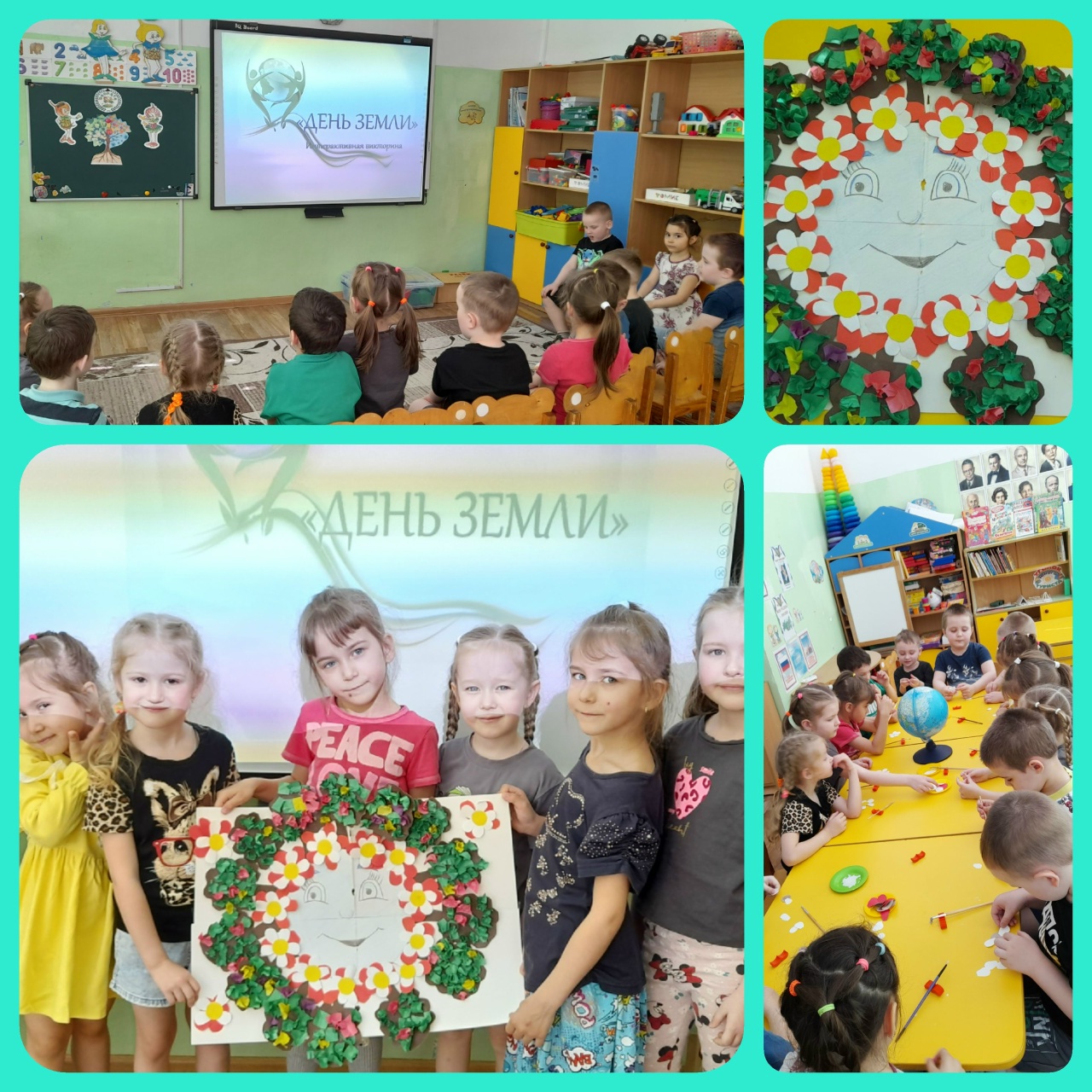 22 апреля отмечается Международный День Земли. Ребята старшей группы посвятили коллективную аппликацию этому Дню. Мы обсудили важность заботы о нашей планете, говорили об экологических ценностях— почему важно беречь природу, не мусорить, заботиться о животных и растениях.